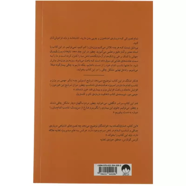 تمام تصوراتی که درباره اضافه وزن و چربی بدن دارید، اشتباهاند و باید فراموششان کنید. بیدلیل نیست که هرچه تلاش میکنیم وزنمان را کم کنیم، نمیتوانیم. در این کتاب با اسناد معتبر و آمار دقیق و علمی میآموزید چطور در این چند دهه تبلیغات پر زرق و برق جهانی با کمک برخی پزشکها و آزمایشگاهها ذهن ما را کنترل کرده است و ما را به سمت عادتهای غذاییای سوق داده است که باعث میشوند روزبهروز وزنمان بیشتر شود. ما نهتنها تناسب اندام خود را از دست دادهایم، بلکه داریم به چاقی بیمارگونه مبتلا میشویم. راهحل نهایی مشکل چاقی را در این کتاب بخوانید.