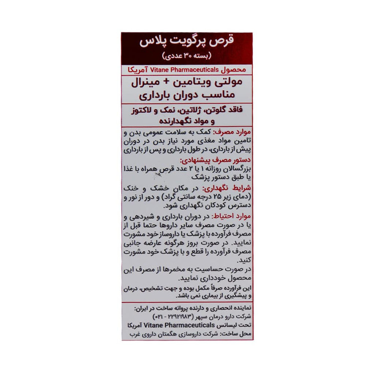 قرص پرگویت پلاس حاوی 23 ویتامین، ماده معدنی، ریزمغذی و آنتی اکسیدان است که فرمولاسیونی کامل برای استفاده قبل، حین و پس از بارداری است و نیاز به استفاده از مکمل های مختلف را برطرف می کند.