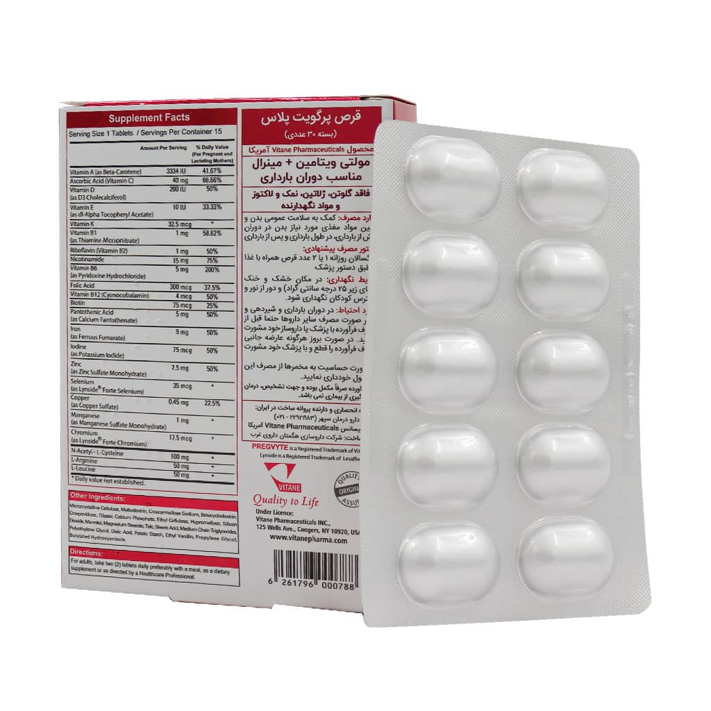 قرص پرگویت پلاس حاوی 23 ویتامین، ماده معدنی، ریزمغذی و آنتی اکسیدان است که فرمولاسیونی کامل برای استفاده قبل، حین و پس از بارداری است و نیاز به استفاده از مکمل های مختلف را برطرف می کند.